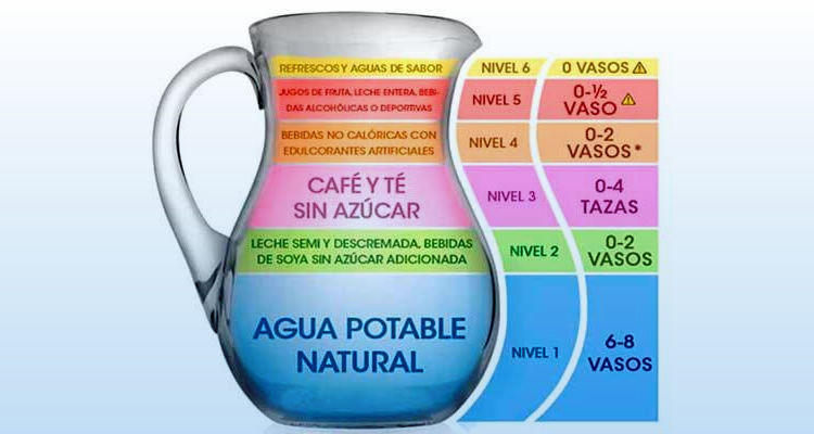 - Nivel 6: ! Bebidas con azúcar y bajo contenido de nutrimentos. Incluye refrescos y bebidas con azúcar adicionada (jugos, aguas de sabor y café). Su consumo se asocia con caries dental y obesidad. Se recomienda no ingerirlas.